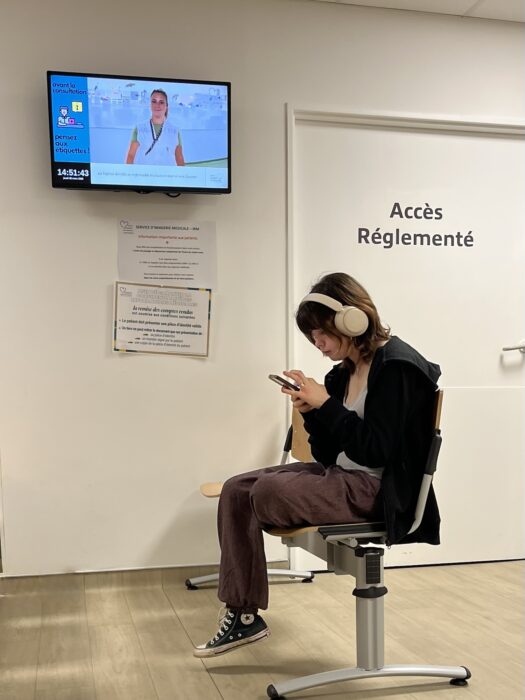 La salle est blanche, clinique. Elle est assise, une bulle de plastique et d’ondes sur les oreilles. Quinze ans, peut-être. Son pouce balaie l’écran du téléphone. Le monde s’arrête là.