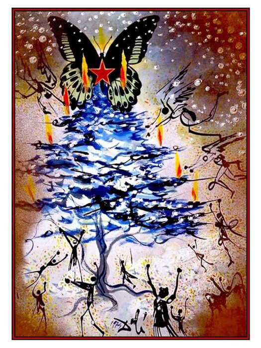 Le sapin est bleu, le givre est froid. Mais au sommet, dans les ailes d’un papillon, brille une étoile rouge.