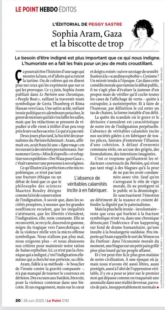 Qu’elle eut surnommé, dans sa chronique du 15 juin, Greta Grunberg, Miss Krisprolls, et rebaptisé son expédition : Des Wasa pour Gaza, était, pour ces « vertueux », outrageusement, perversement raciste.